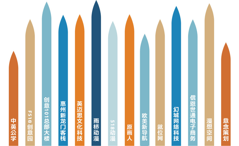 深圳中英公學(xué)(文化教育);深圳F518創(chuàng)意園(文化園區(qū));深圳創(chuàng)意101設(shè)計總部大樓(文化總部);惠州新龍門客棧(文化旅游)等14家文化企業(yè)共同組成。
