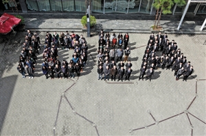 深圳市創(chuàng)意投資集團團體成員排成IDEA字母形狀的俯拍圖。?